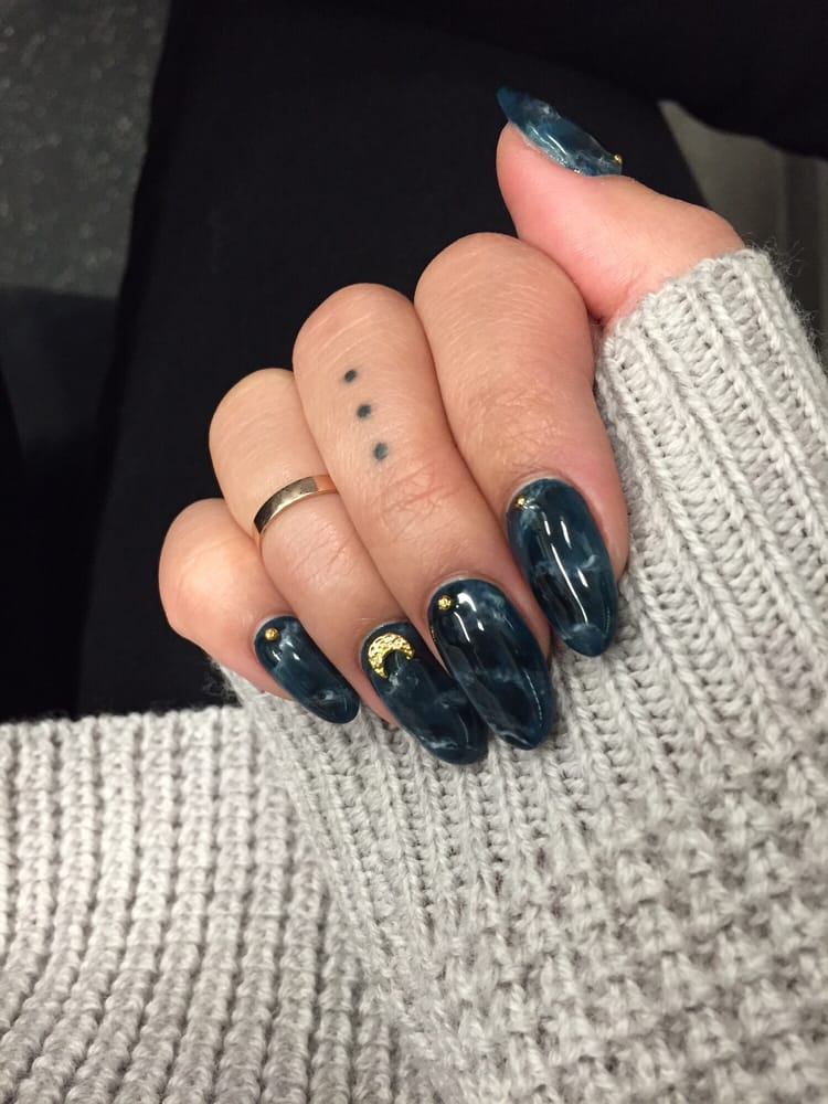 This is one of my favorites. This blue can pass off as black in some lighting but then your mom/mother in law can’t nag, because you can tell them “Actually, it’s blue.” *hair flip* The triangle shapes, is what I believe to be cut out foil or something, whatever it is, it’s so cool because it gives this 3D effect on your nails.